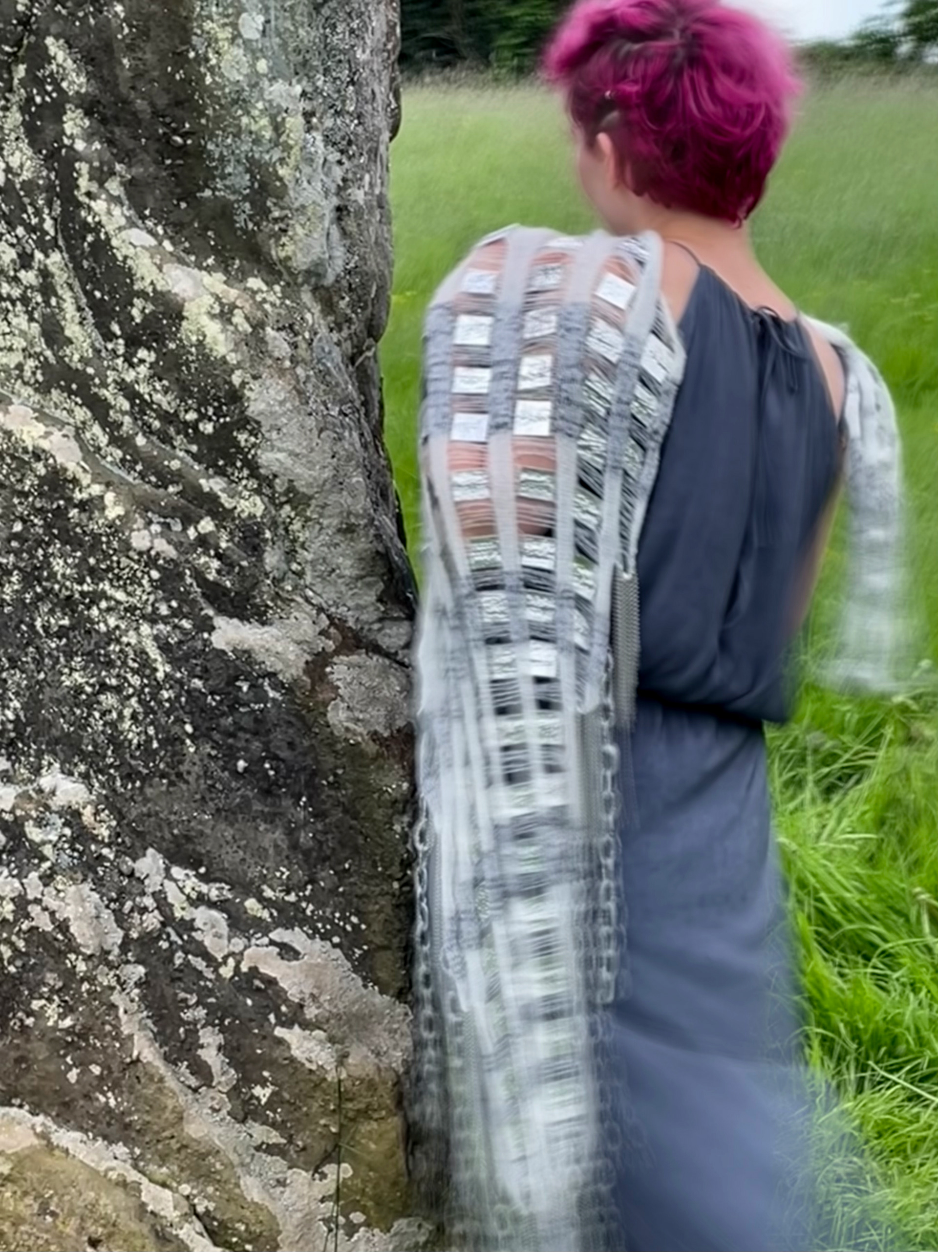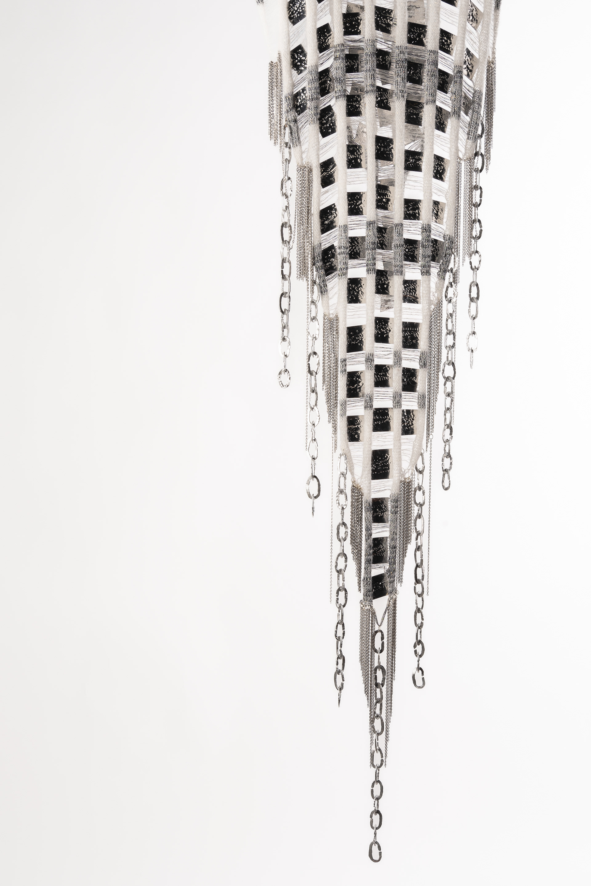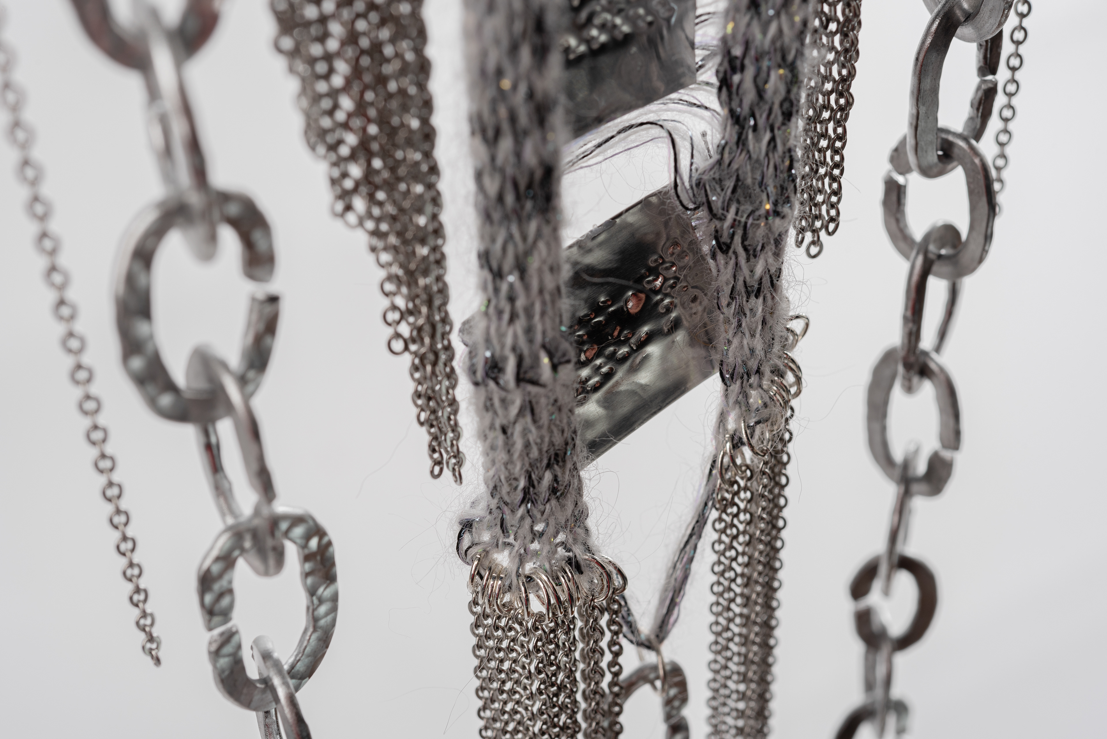 A handcrafted veil composed of a machine knitted base and aluminium embellishments. This piece symbolises strength and resilience and draws from elements of traditional armour. Exhibited in Llantarnam Grange Arts Centre in 2023. 250cm x 50cm.