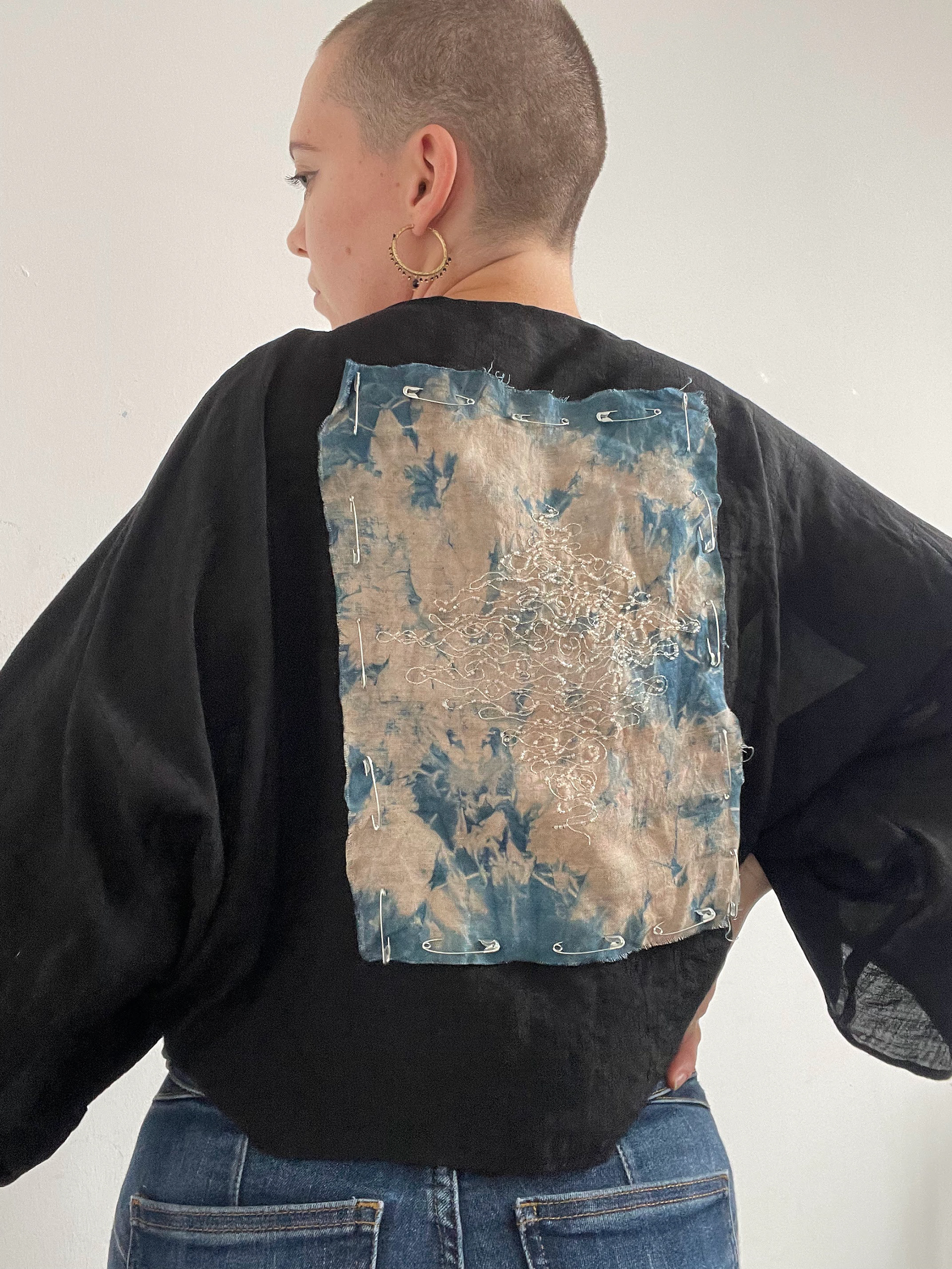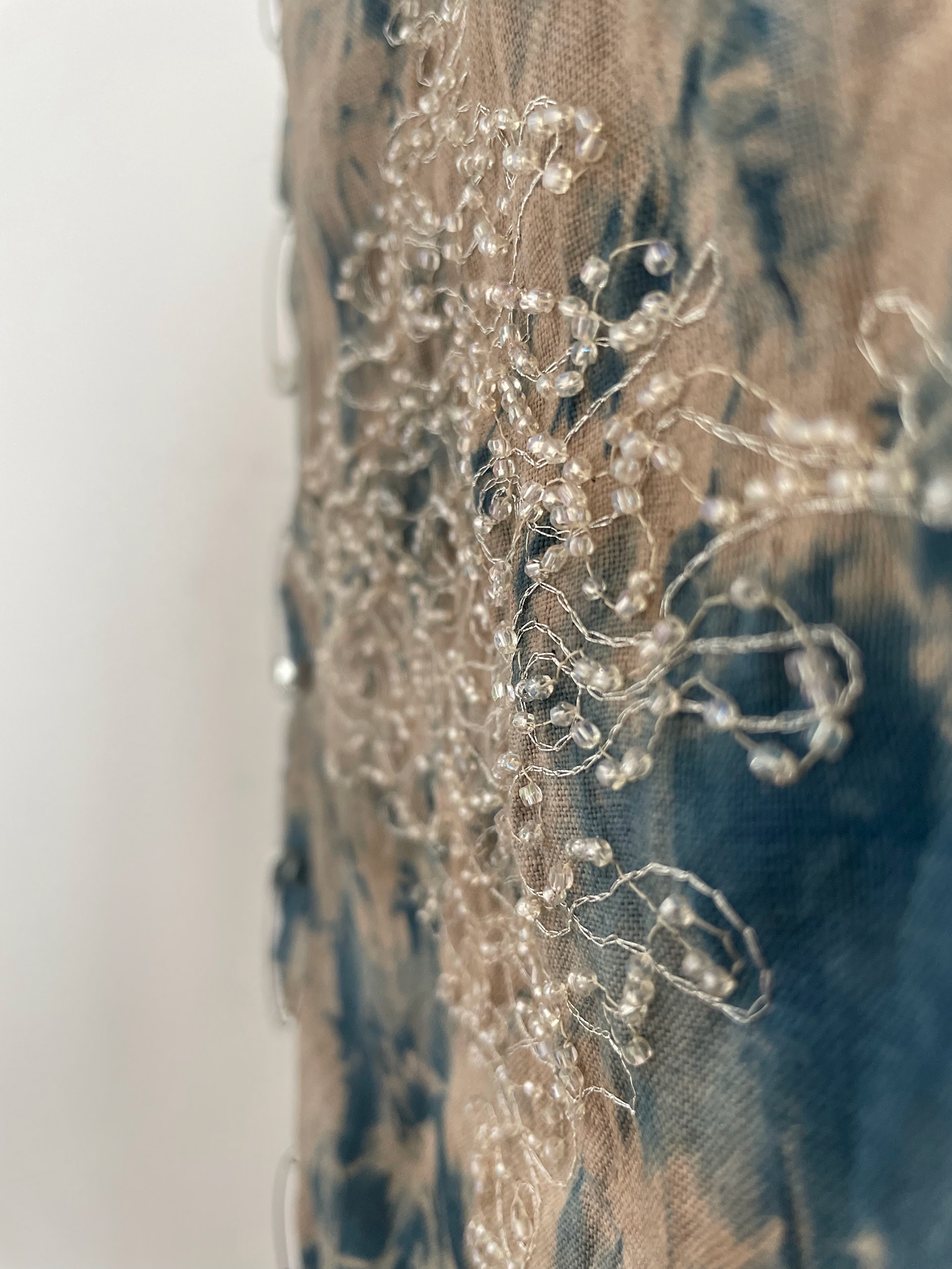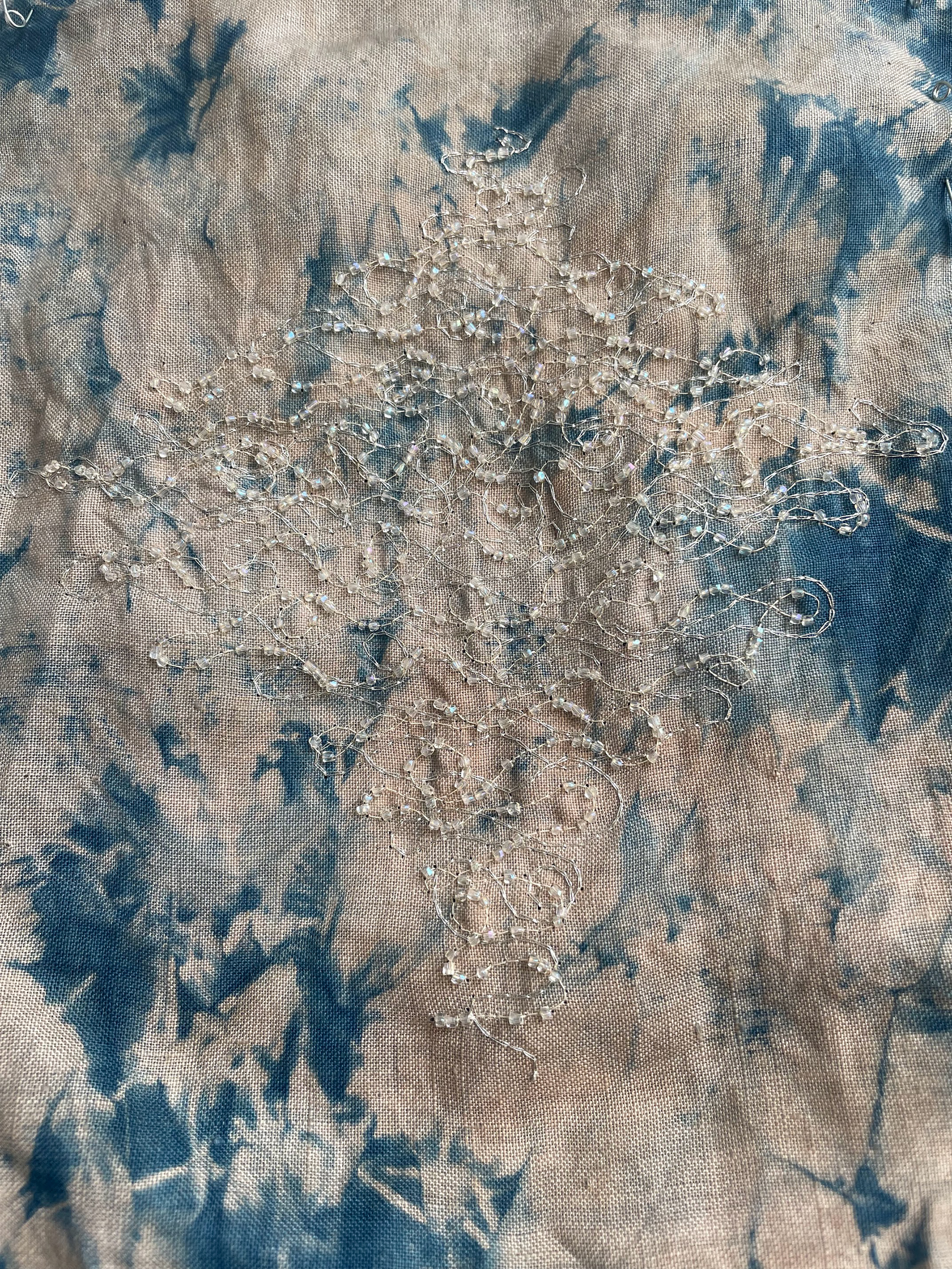 Indigo-dyed cotton patch embroidered with Tambour beading using vintage glass beads. Removable patch can be fastened to any garment to suit the wearer. 30cm x 20cm.
