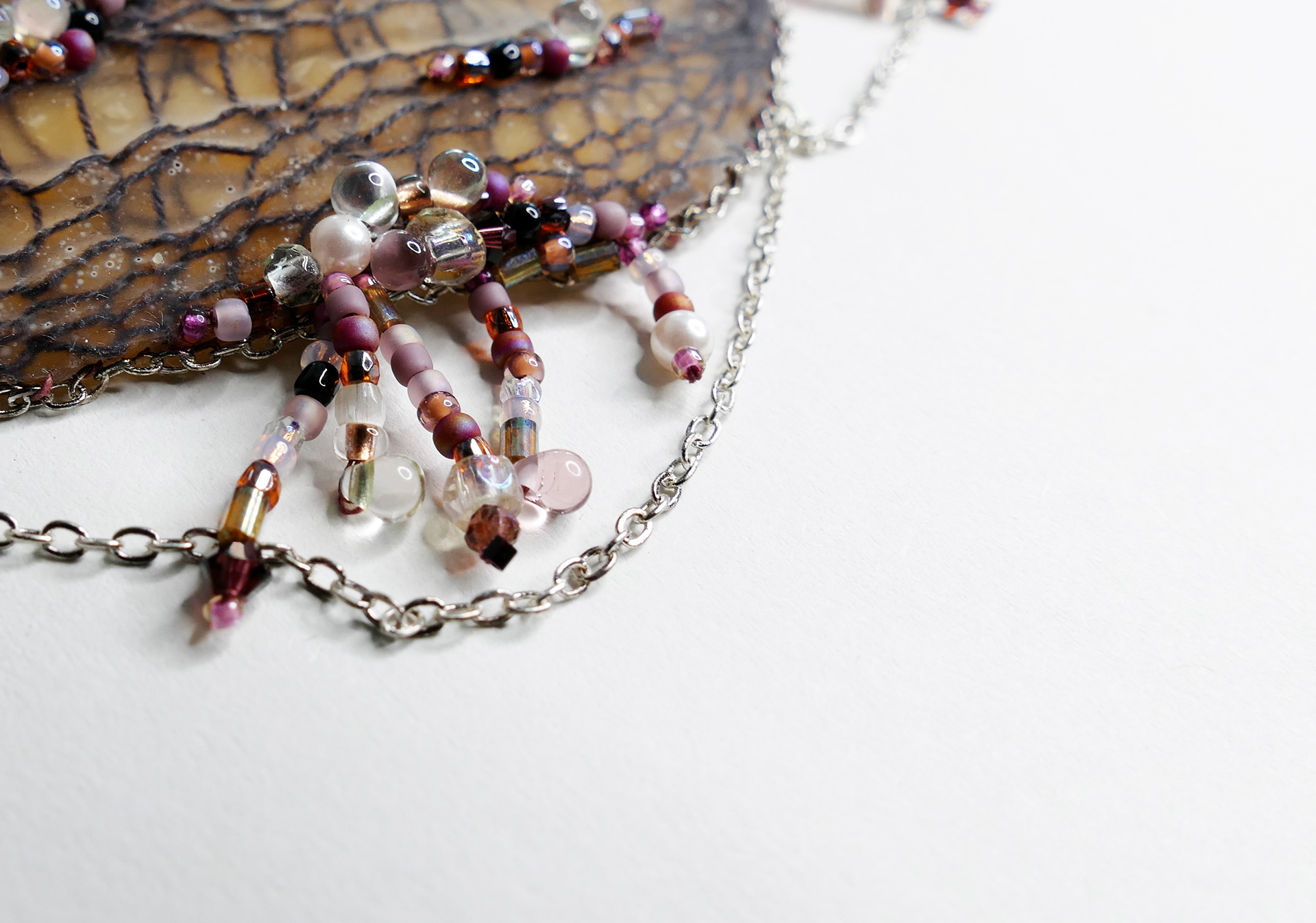 This unique brooch features a bold safety pin clasp, a silk and latex base, and is decorated with beaded clusters and silver-plated chains for a modern, organic look. Contains latex. Measures approximately 12cm x 8cm.