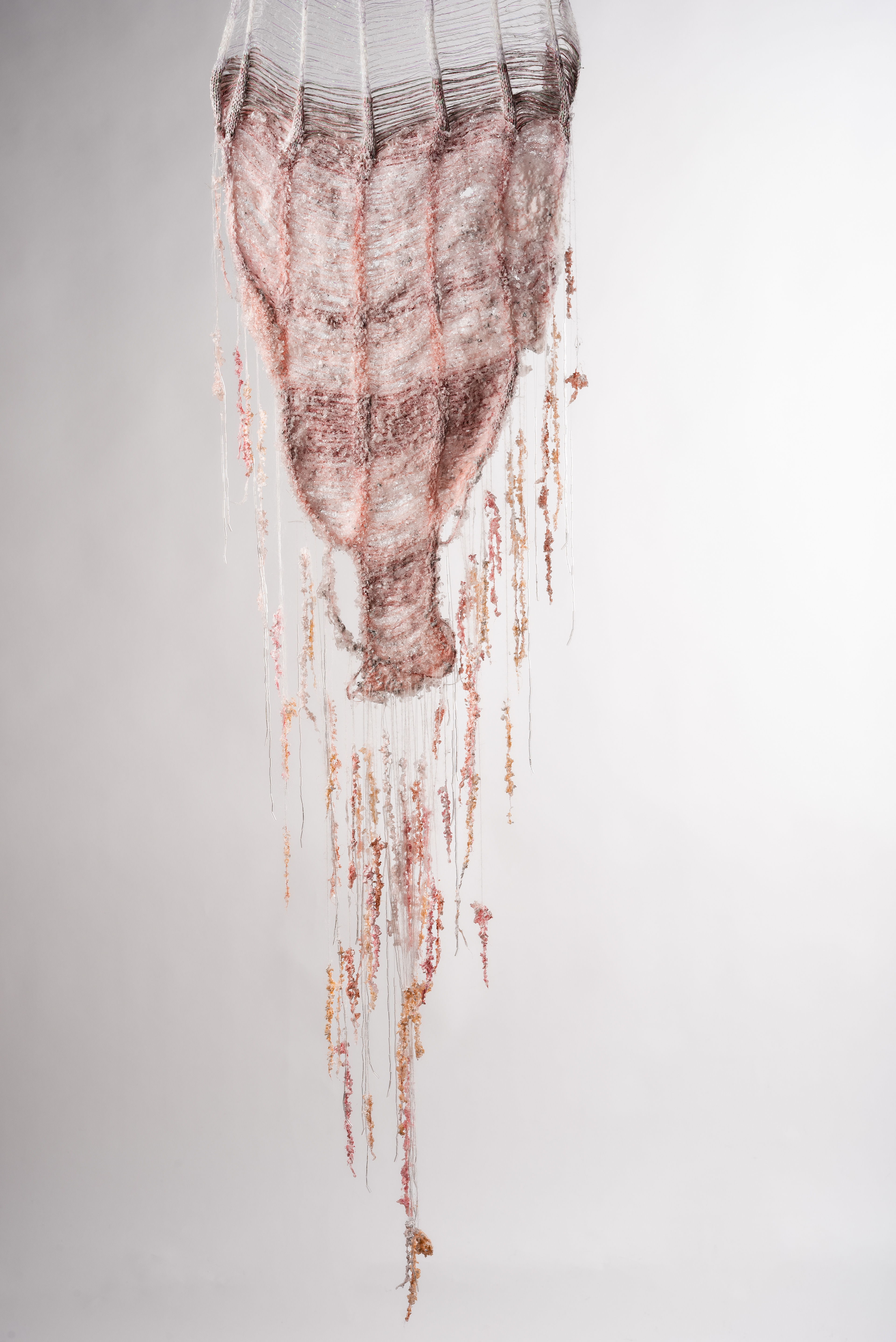 A handmade veil created by growing salt crystals onto a machine knitted structure. This piece represents feelings of transformation and growth, with the salt crystals symbolising solidified tears. Exhibited in Llantarnam Grange Arts Centre in 2023. 250cm x 50cm.