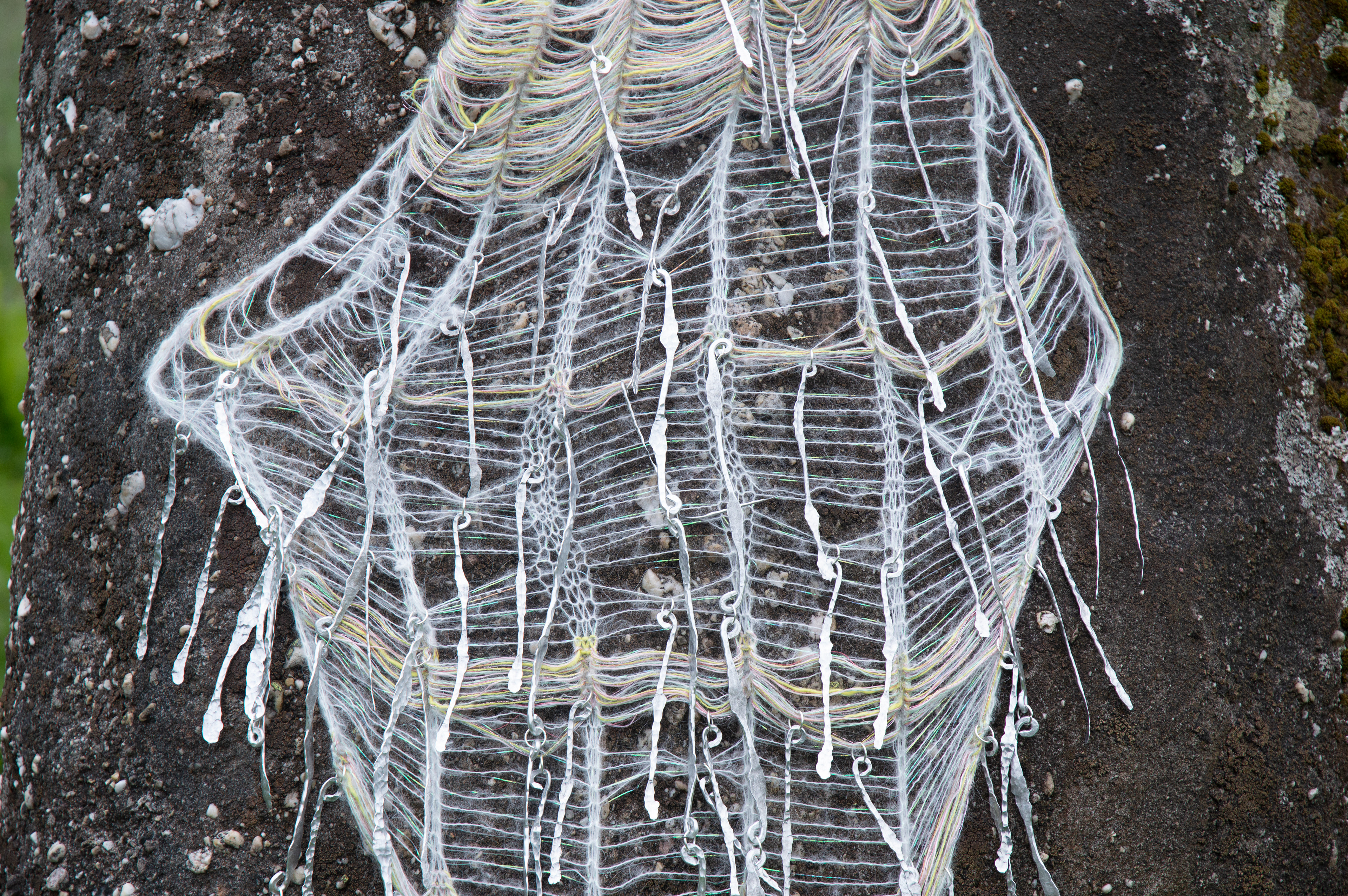 A bespoke veil created using machine knit and hammered aluminium embellishments. This piece captures emotions of fragility and sorrow. Exhibited in Llantarnam Grange Arts Centre in 2023. 250cm x 50cm.